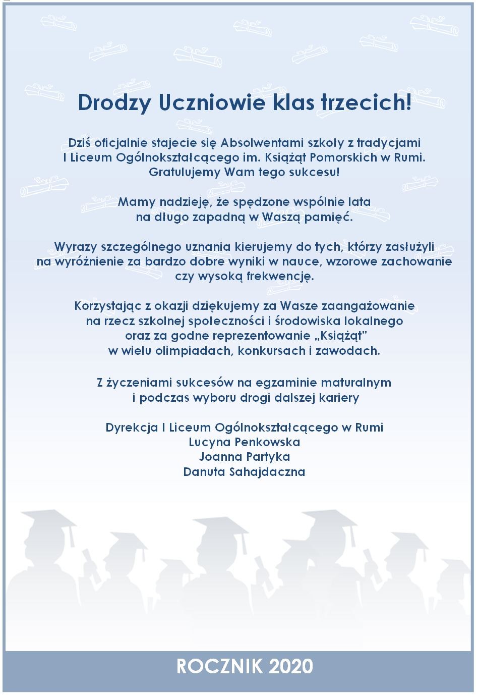 Spokojnych Świąt Narodzenia Pańskiego, urokliwego nastroju wigilijnej wieczerzy spędzonej w gronie najbliższych przy dźwiękach kolęd, zgody i pojednania ukrytych w białym opłatku, wielu radości i wzruszeń, a w Nowym Roku – optymizmu, niespożytych sił do realizacji nowych wyzwań, wiary, co góry przenosi, nadziei, która dodaje sił oraz dużo zdrowia życzy społeczność szkolna I Liceum Ogólnokształcącego w Rumi