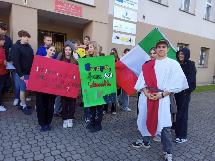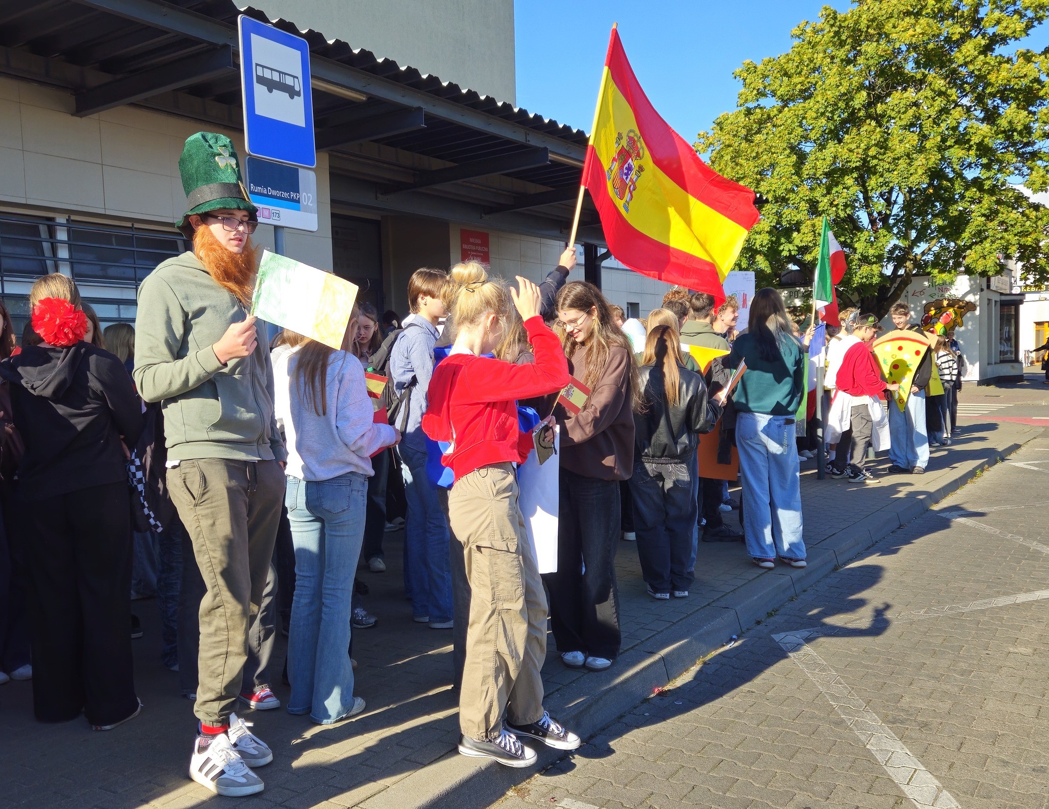 Kolorowy korowód państw europejskich, utworzony przez uczniów klas pierwszych naszego liceum, przeszedł w piątek ulicami Rumi z okazji Europejskiego Dnia Języków. Nasi uczniowie, ubrani w stroje przywołujące na myśl Hiszpanię, Wielką Brytanię, Irlandię, Niemcy i Włochy udali się w kierunku Stacji Kultura, rozdając po drodze przechodniom pozytywne cytaty w różnych językach, żeby umilić im dzień oraz zainspirować do nauki języków.