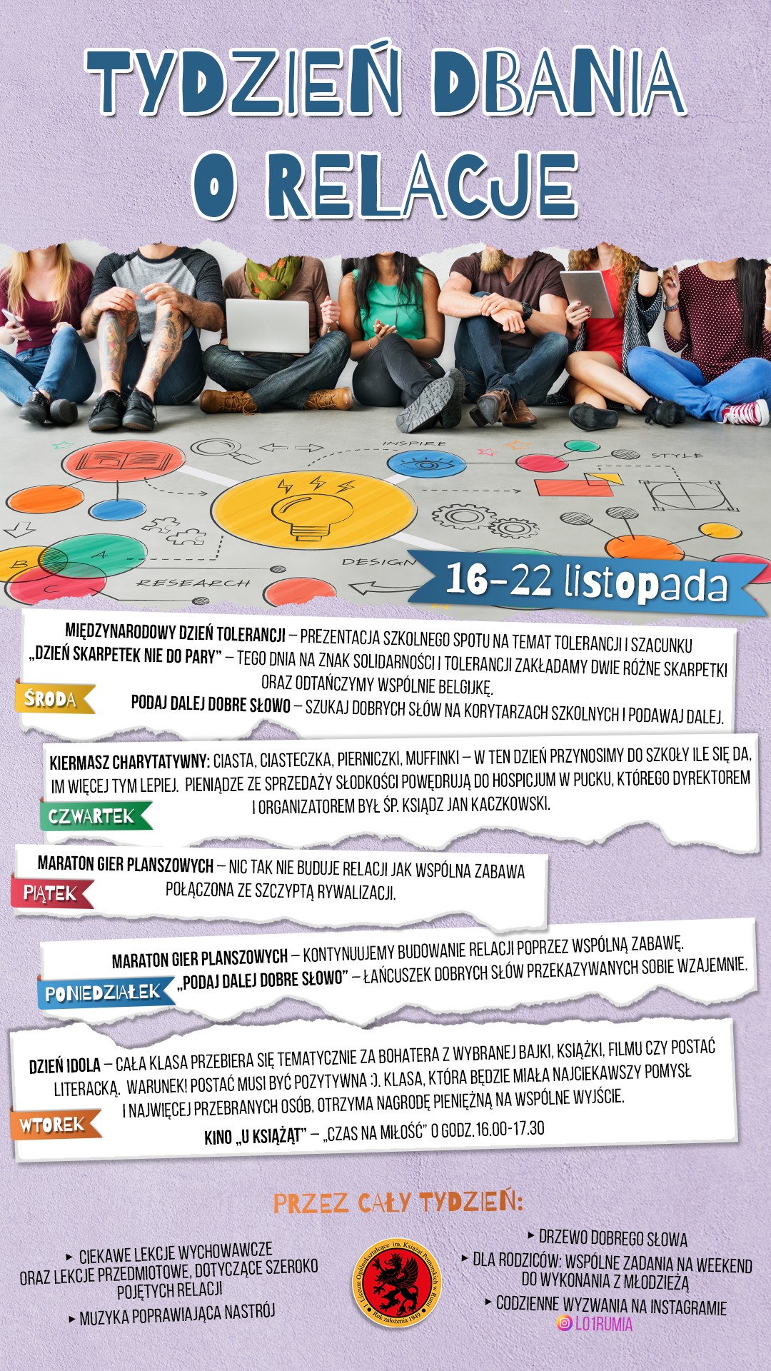 Od najbliższej środy rusza TYDZIEŃ DBANIA O RELACJE. To już druga edycja projektu powstałego ze współpracy z Fundacją Dam o Mój Zasięg - Szkoła Odpowiedzialna Cyfrowo. W ramach tego tygodnia wspólnie z Samorządem Uczniowskim zaplanowaliśmy dla Uczniów, Rodziców i Nauczycieli wspólne aktywności. Będzie się działo! Śledźcie nas na szkolnym Facebooku i Insagramie oraz zaglądajcie do dziennika elektronicznego Librus.