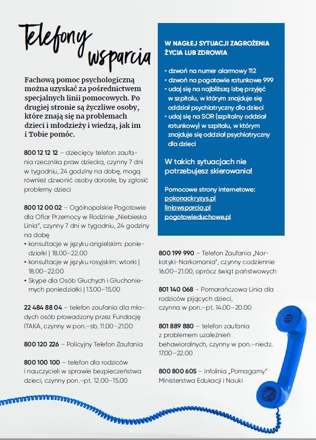 Telefon Zaufania dla Dzieci i Młodzieży 116 111 jest czynny od 12.00 do 22.00, a z jego konsultantami można się również skontaktować wysyłając anonimową wiadomość online przez www.116111.pl/napisz Więcej informacji: www.116111.pl