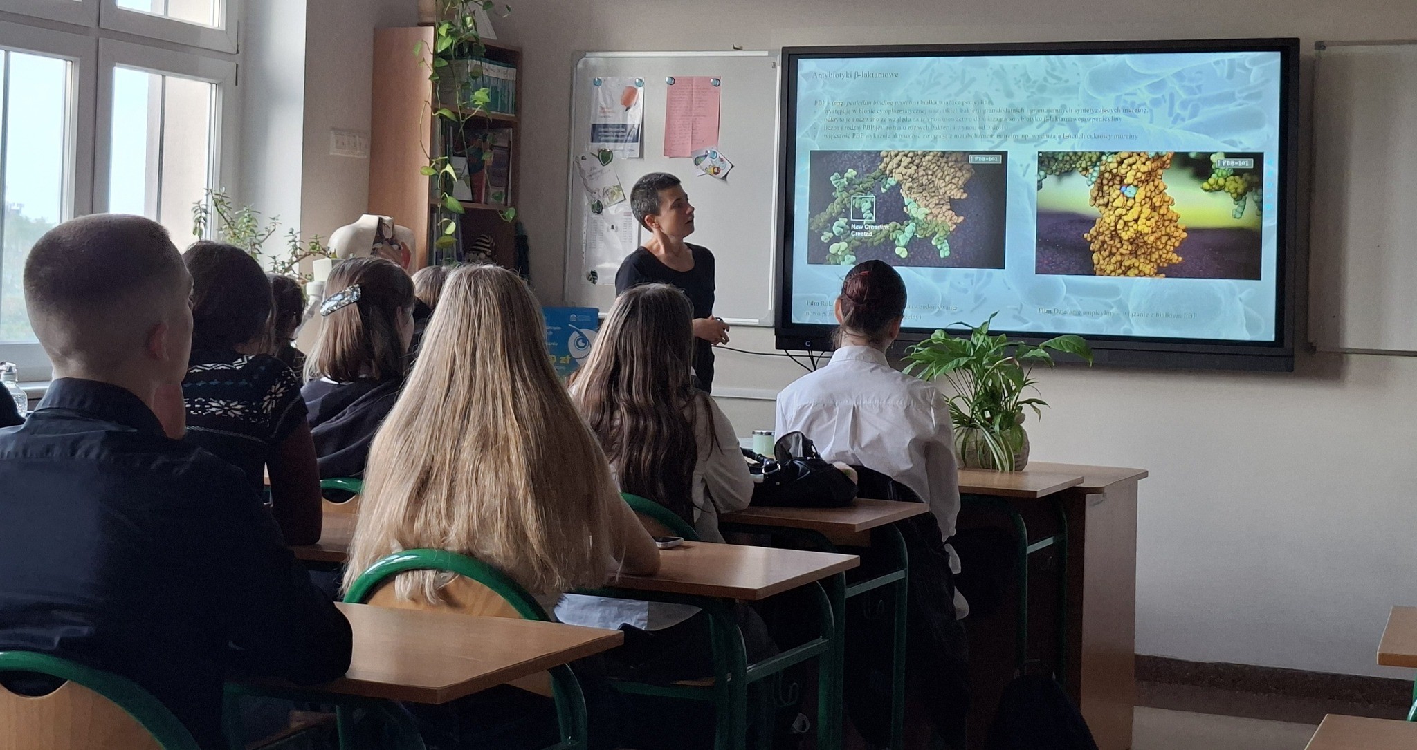 10 października gościliśmy w naszej szkole panią dr Annę Kot z Wydziału Biologii Uniwersytetu Gdańskiego. Pani doktor w ramach programu edukacyjnego „Poznaj pracę biologa” przedstawiła uczennicom i uczniom klasy drugiej rozszerzającym biologię tematykę związaną z bakteriami i lekoopornością. Młodzież miała także możliwość uczestniczenia w dyskusji na temat wprowadzania leków na rynek, badań nad lekami „sierocymi”, problematyką ogólnie pojętej profilaktyki chorób cywilizacyjnych.