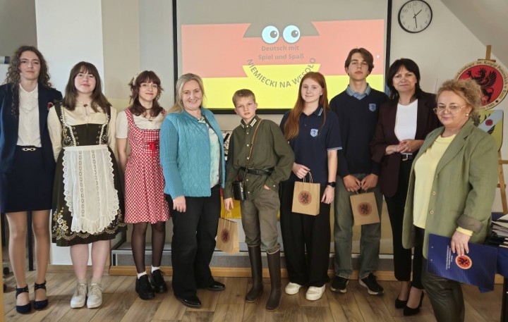 Dnia 13 kwietnia 2026 r. w naszej szkole odbył się II i III etap konkursu języka niemieckiego „Deutsch mit Spiel und Spaß, czyli niemiecki na wesoło”. Do udziału w nim zakwalifikowali się uczniowie klas VII i VIII szkół podstawowych, którzy przystąpili do rywalizacji w trzyosobowych zespołach.
